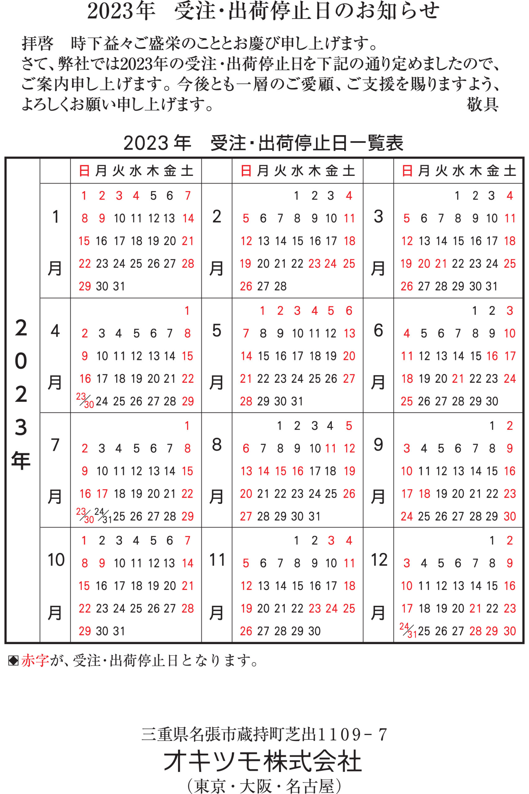 さて弊社では2023年の受注・出荷停止日を下記の通りさだめましたので、ご案内申し上げます。