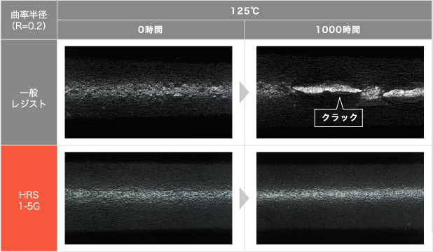 一般品はクラックが入りますが、HRS-1-5Gは125℃×1000時間後もクラックが入りません。